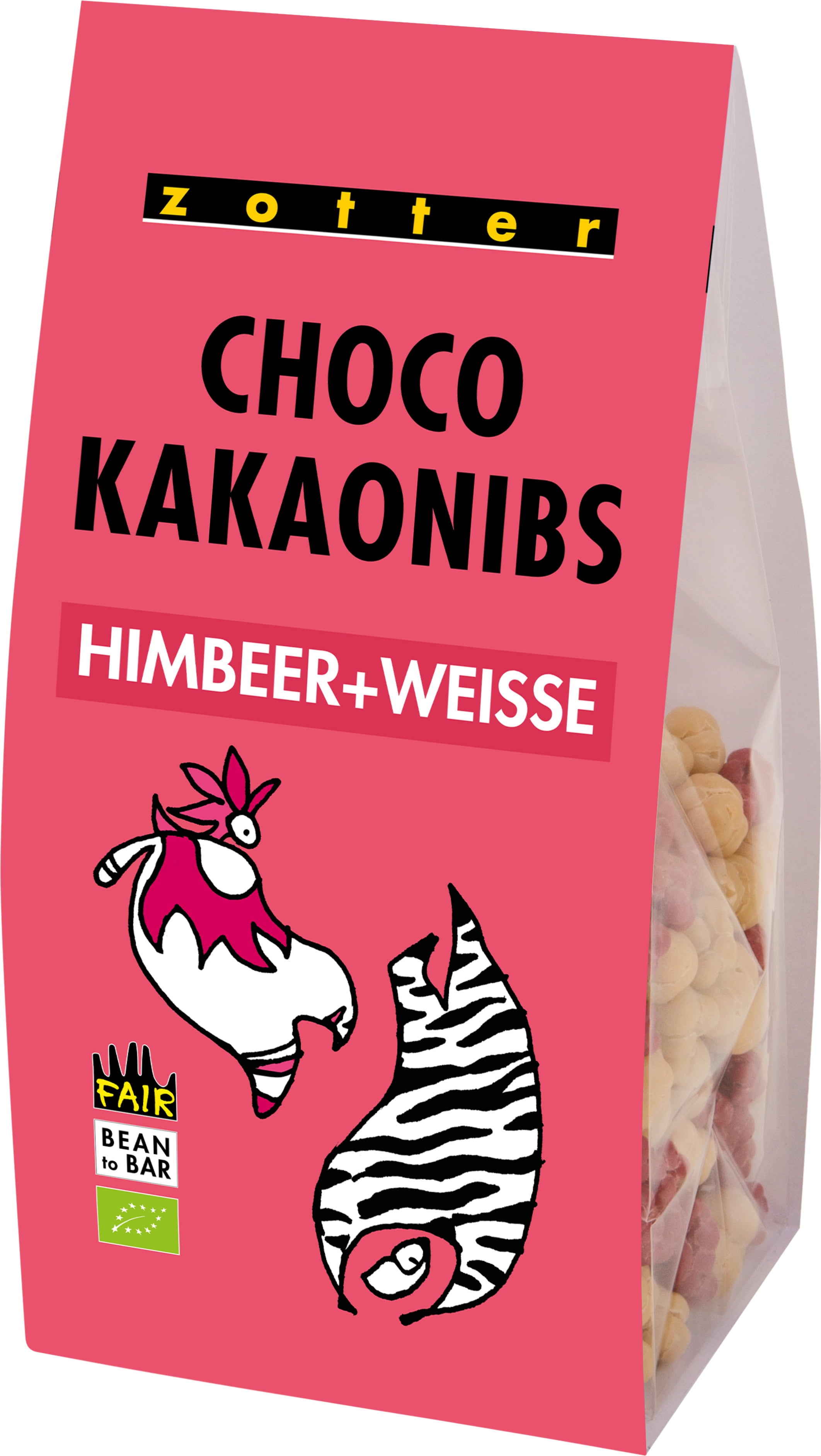 Owocowa, słodka przekąska marki Zotter: chrupiące, świeżo prażone kawałki ziaren kakaowca w owocowej kuwerturze malinowej i białej czekoladzie! Nie tylko jako przekąska, ale również jako pyszna posypka do deserów, wypieków, jogurtów czy musli.