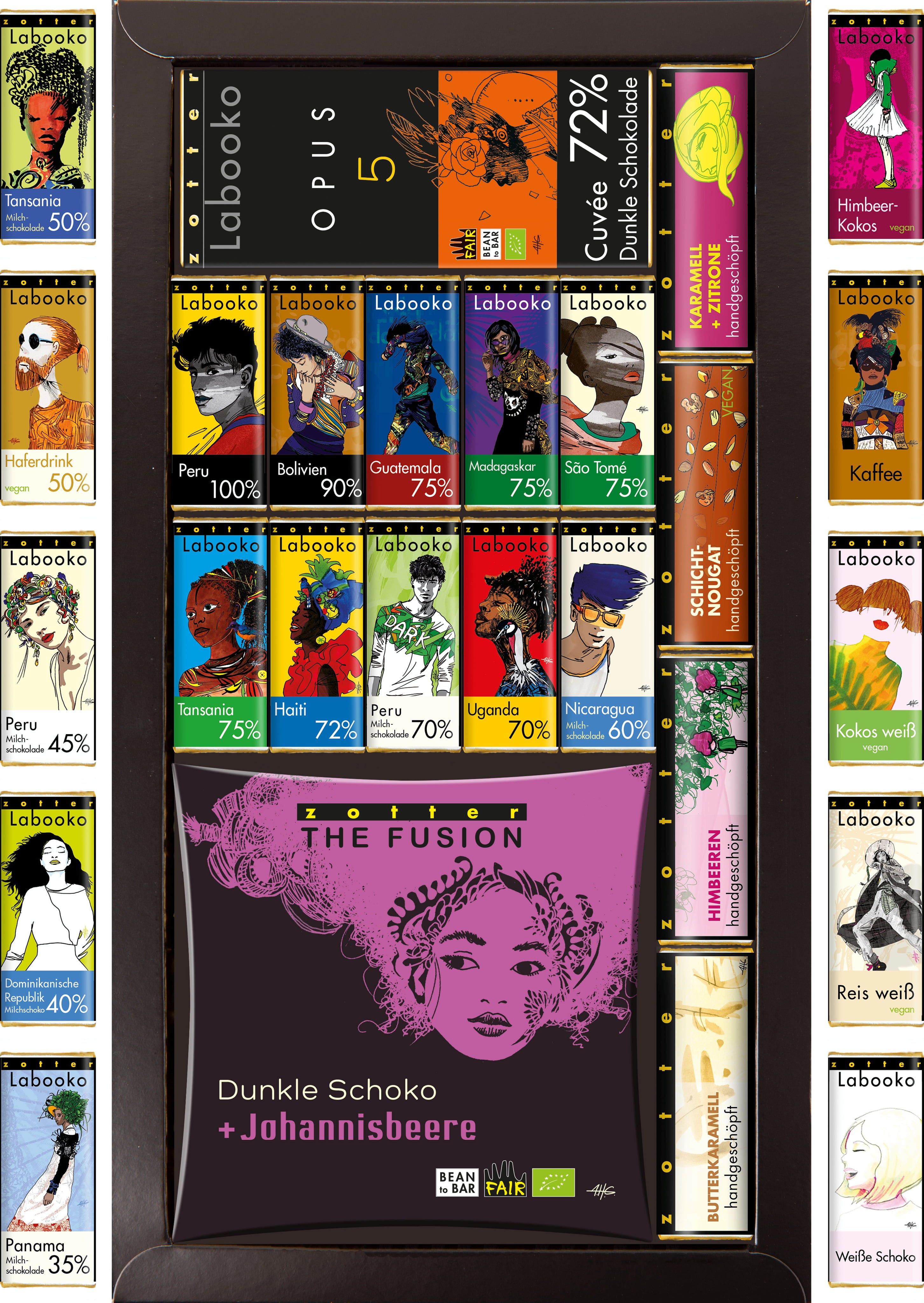 Ten zestaw upominkowy zawiera 26 różnych rodzajów czekolady i zapewnia wgląd w świat słodkich delikatesów. Labooko minis z najlepszych regionów kakaowych na świecie, pyszne ciemne i mleczne czekolady, a nawet tabliczki czysto roślinne.