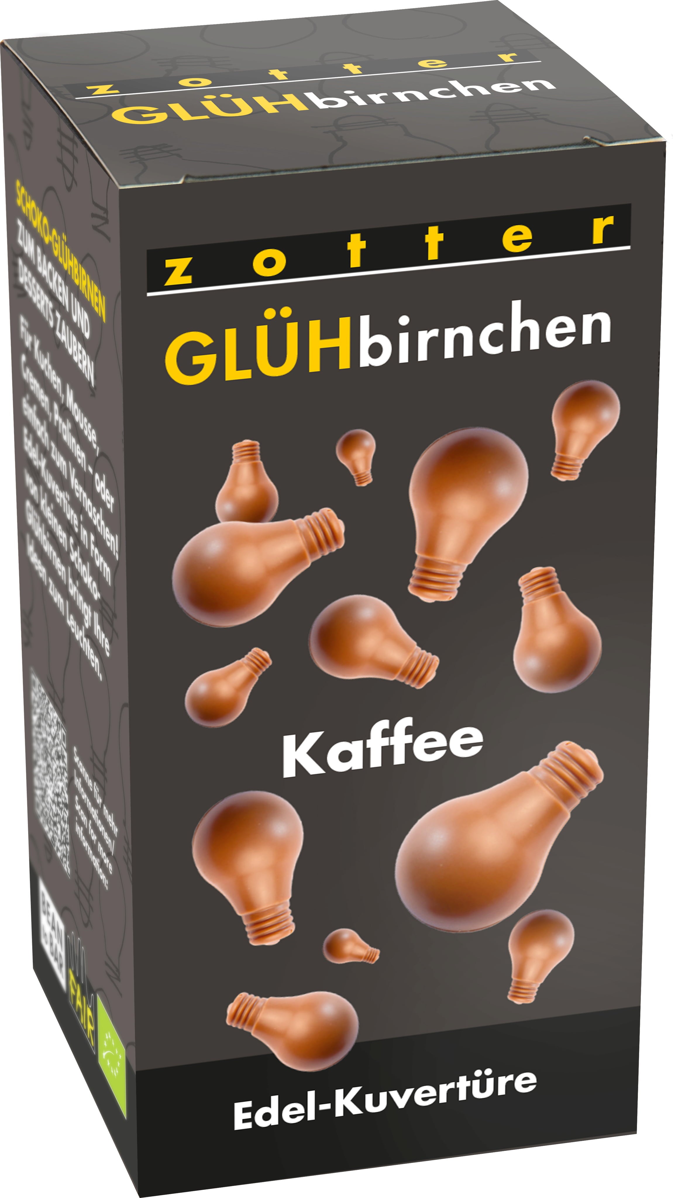 Pyszna smaczna słodycz w kształcie czekoladowych żaróweczek składa się z kawy z własnej palarni kawy Zotter, prawdziwego masła kakaowego i cukru trzcinowego. Zawiera odrobinę organicznego mleka pochodzącego z Tyrolu. Doskonałe również do dekoracji.