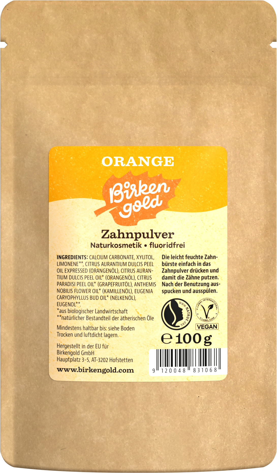 Zobni prašek z Birkengold® ksilitolom in sadnim, svežim okusom pomaranče je primeren ne le za odrasle, temveč tudi za otroke od 1. leta starosti. V kombinaciji s kalcijevim karbonatom in eteričnimi olji nežno čisti, ohranja zobno sklenino in spodbuja alkalno okolje v ustih - slabo okolje za karies in parodontalne bakterije!