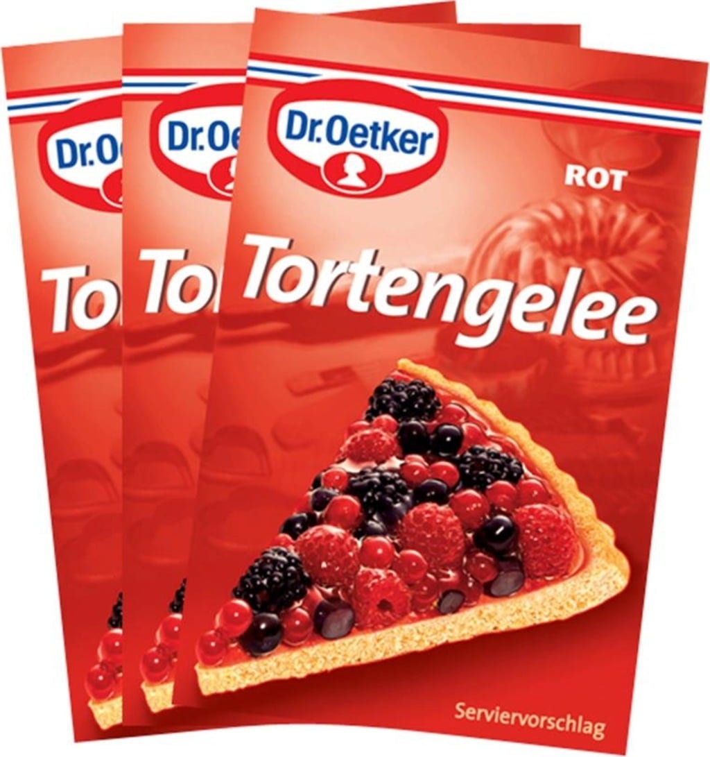 Tortni žele oznamke Dr. Oetker se meša z vodo ali sadnim sokom, da nastane čvrst žele za različne sadne torte in podobno.