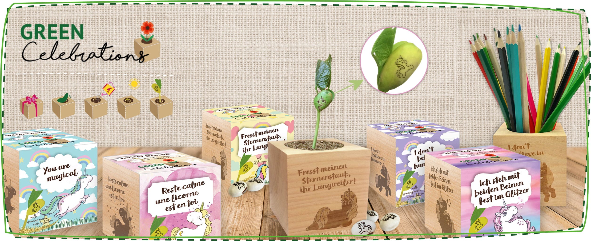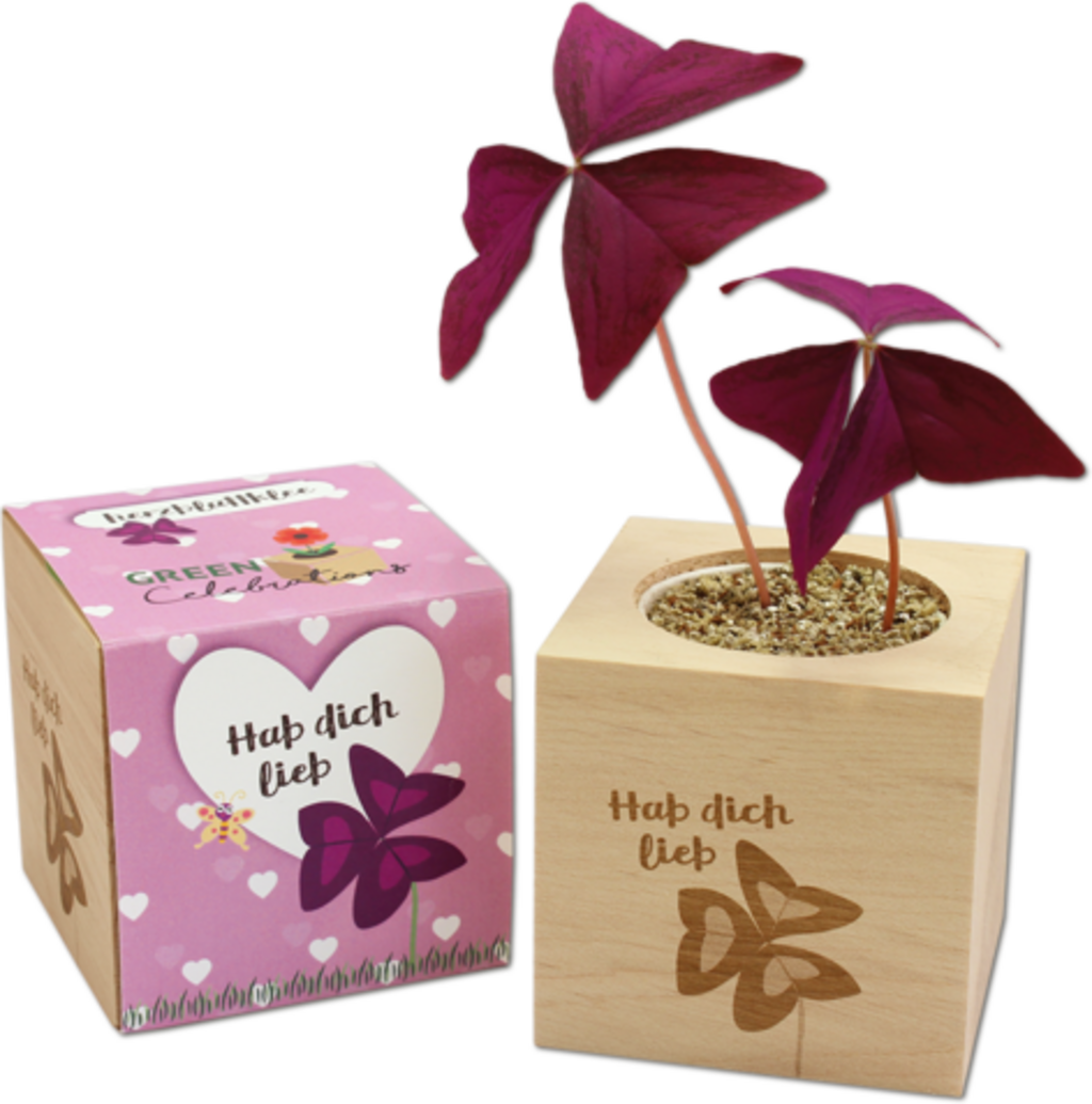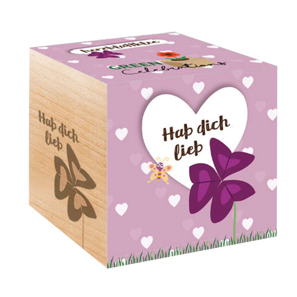 Iščete nenavadno in hkrati osebno idejo za darilo? Lesena kocka Green Celebrations "Srečna deteljica" iz jelševega lesa z visokokakovostno gravuro je darilo iz srca, ki vsebuje rastlinska semena in poseben rastni granulat.