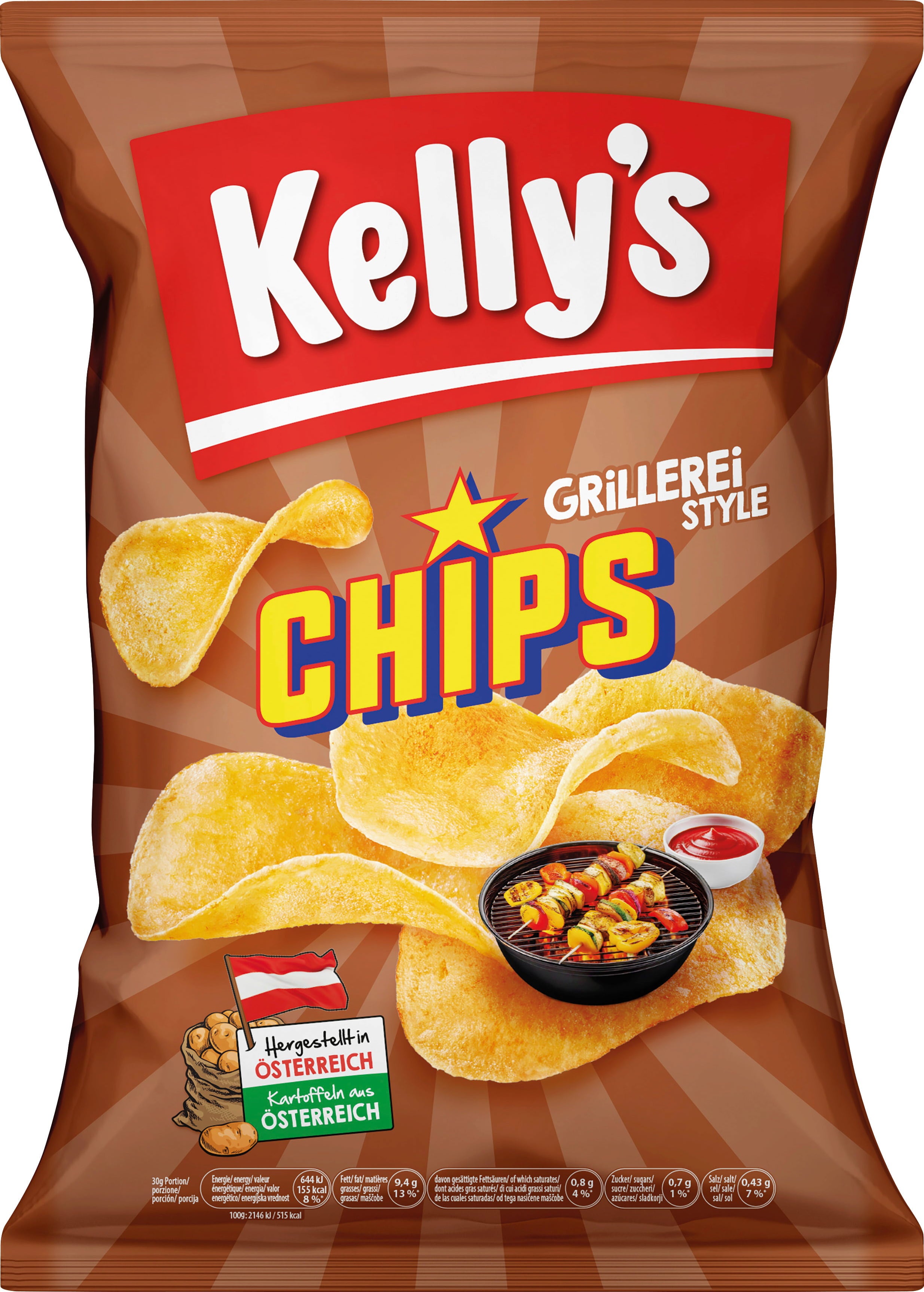 100% avstrijski krompir, sol iz domačih Alp in skrbno izbrana zelišča poskrbijo za poln okus, popolna odsotnost ojačevalcev pa naredi Kelly's Chips idealen prigrizek. Najnovejša različica Grill Style bo s svojo dimljeno in rahlo sladko BBQ aromo zagotovo navdušila.