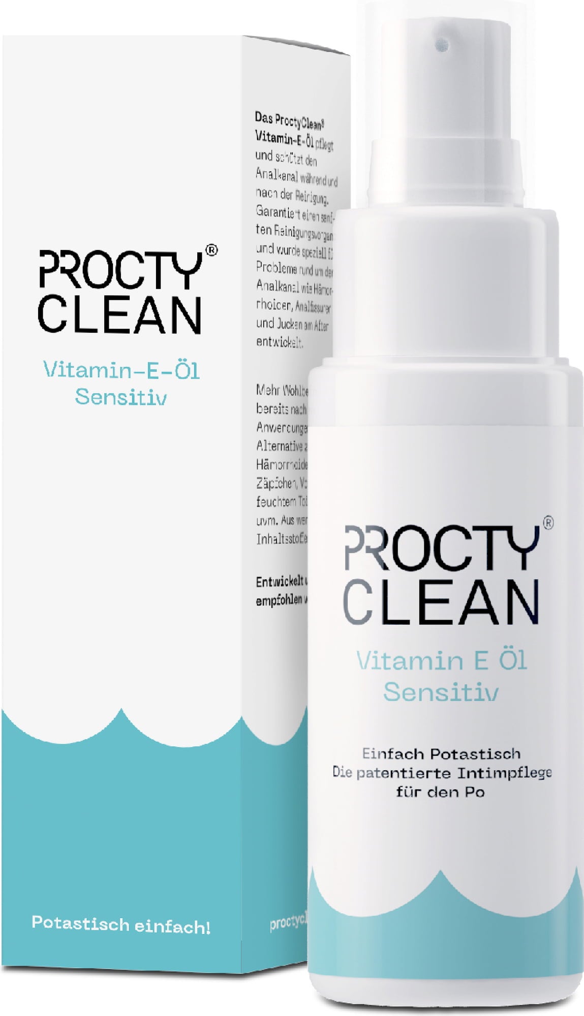 Olje ProctyClean® z vitaminom E neguje in ščiti očiščeni analni kanal med čiščenjem in po njem. Zagotavlja nežno čiščenje in je bil razvit posebej za težave v analnem kanalu, kot so hemoroidi, analne razpoke in srbečica v anusu. Več dobrega počutja že po nekaj nanosih. Alternativa za mazilo za hemoroide, svečke, blazinice, vlažni toaletni papir in še veliko več. Narejen je iz dragocenih sestavin, kot so sončnično olje, visoko doziran vitamin E, azulen, bisabolol in kamilica. Razvili in priporočili so ga zdravniki. 100-odstotno izdelano v Nemčiji.
