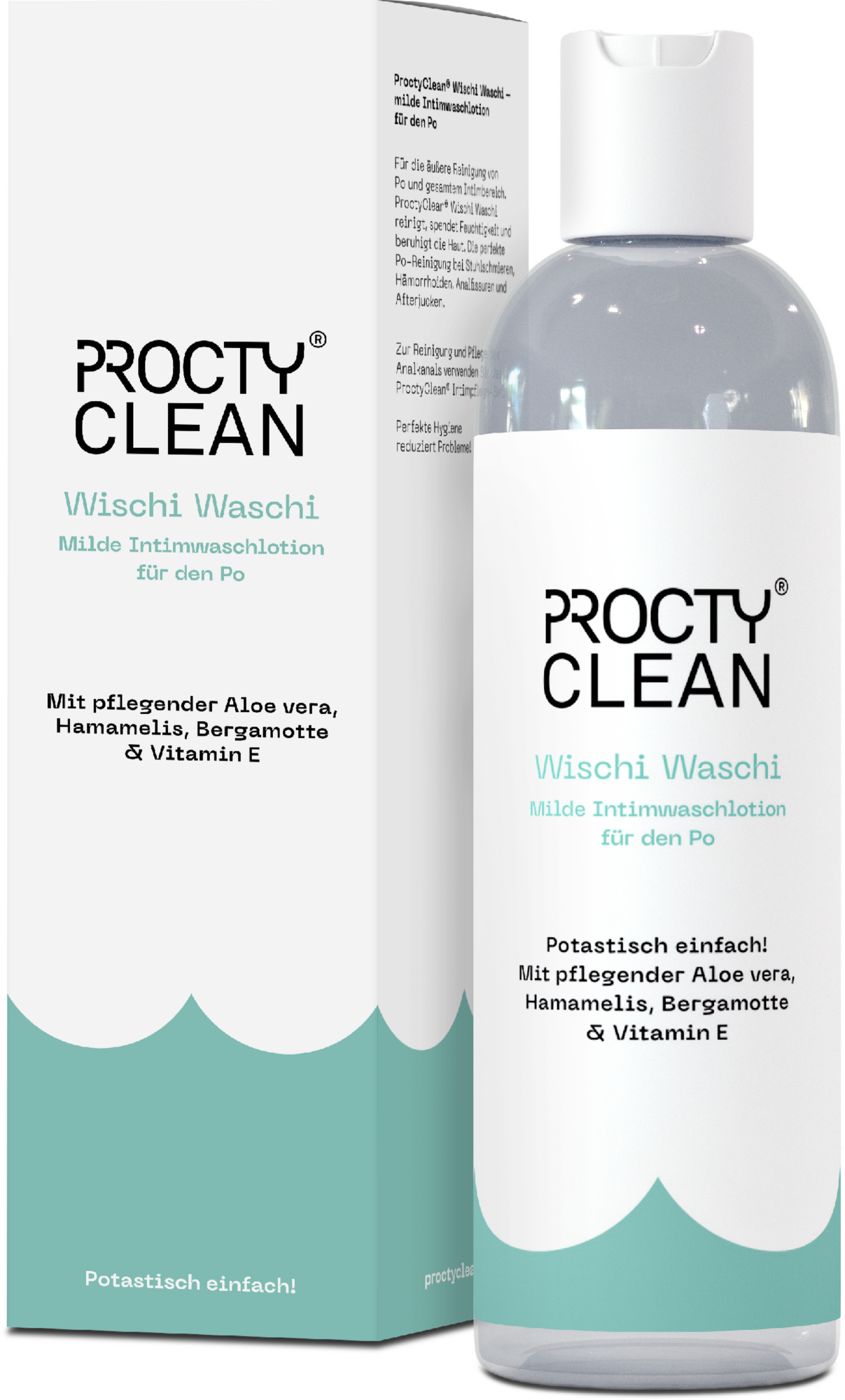 ProctyClean® Wischi Waschi je losjon za intimno umivanje, posebej razvit za zunanje čiščenje zadnjika. Losjon je idealen za boj proti razmazom blata, hemoroidom, analnim razpokam in srbečici na zadnjični odprtini.